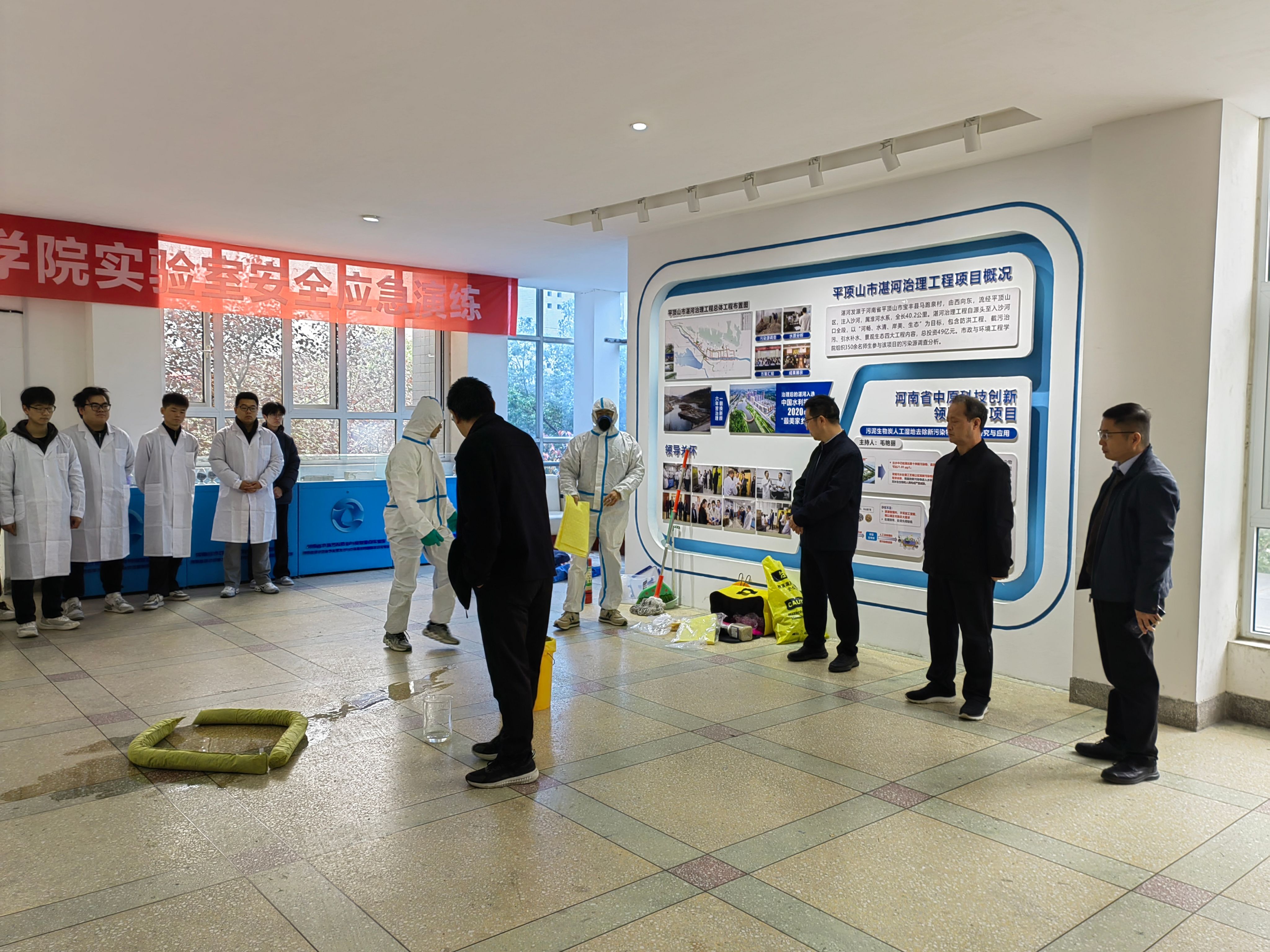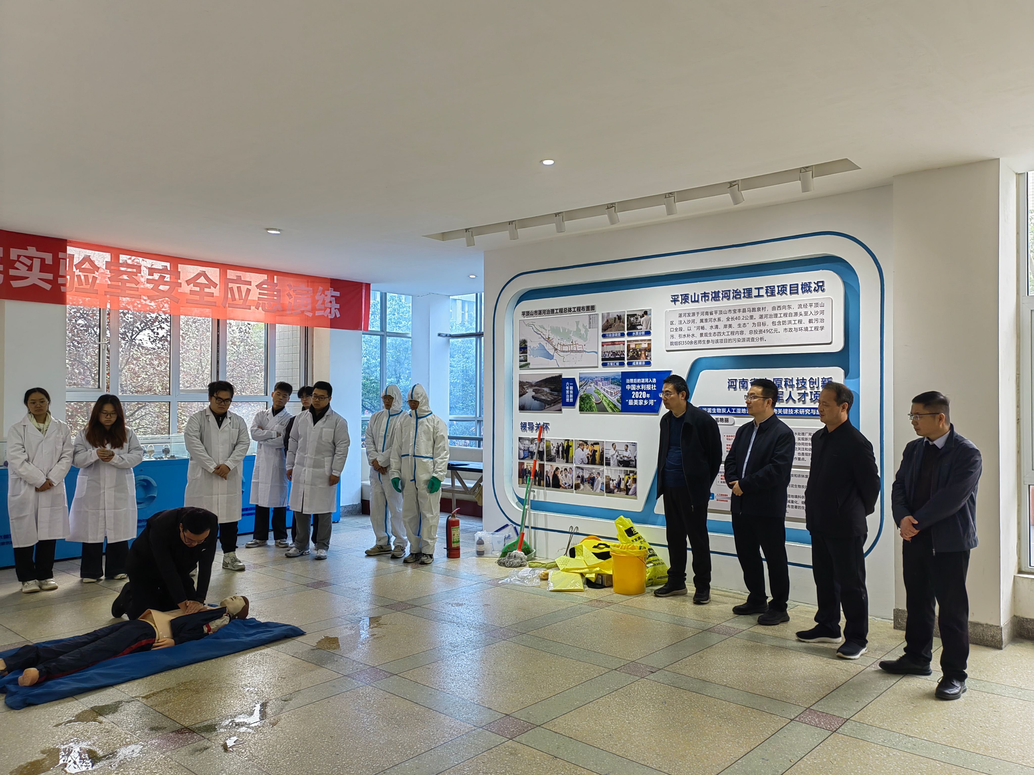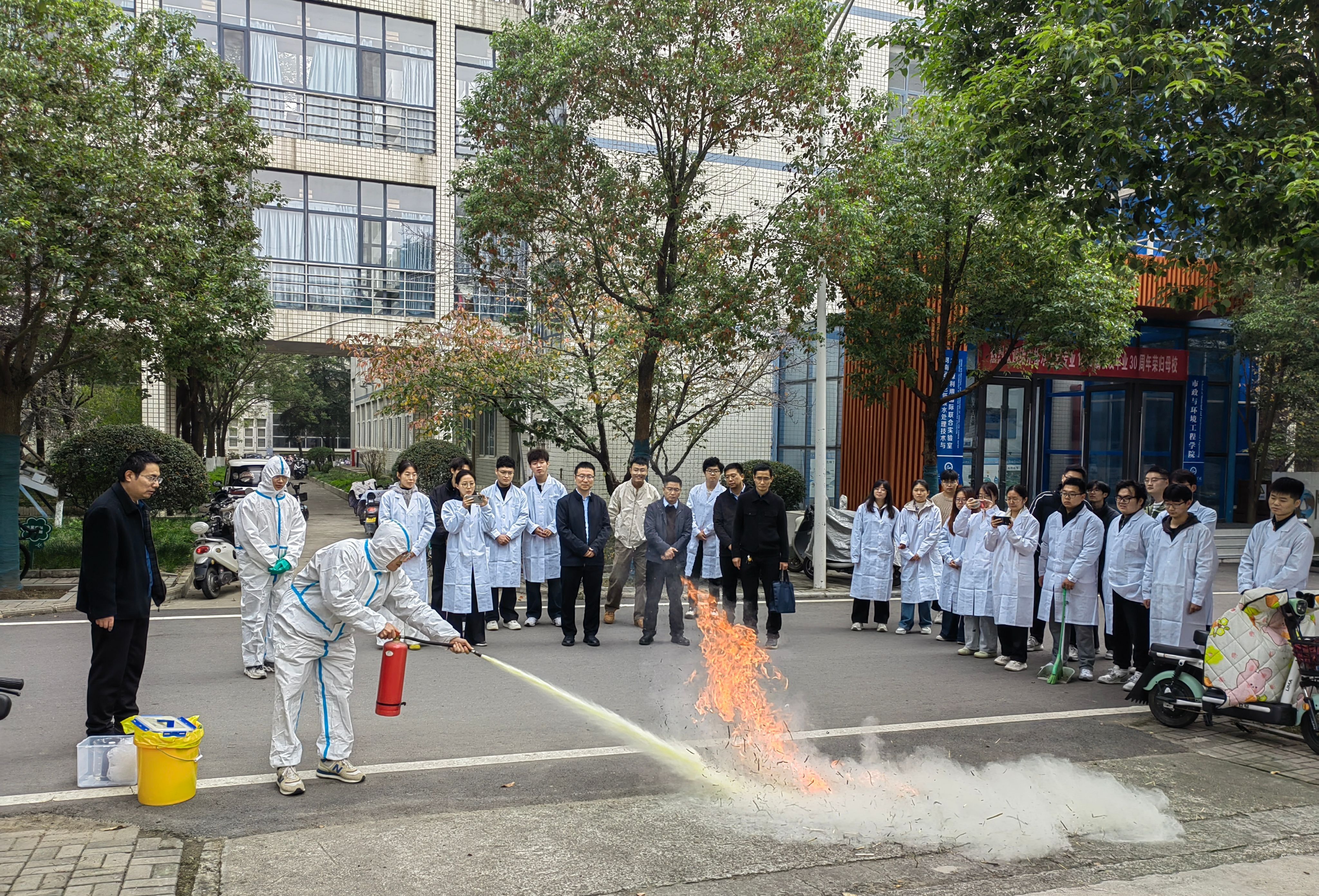 根据学校2025年实验室安全文化宣传月活动安排,为提高师生实验室安全意识,提高师生应急处突能力。我院于11月11日上午在9号楼B座二楼大厅和一楼门前道路上开展了2025年实验室安全应急演练。学院书记曹恒慧、院长姜忠峰、实验中心负责人、研究生参加此次活动,活动由副院长王超海主持。