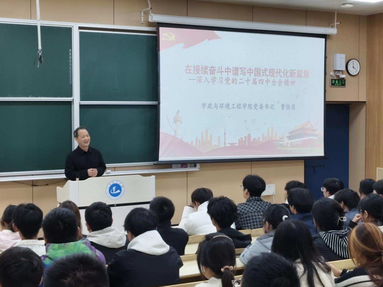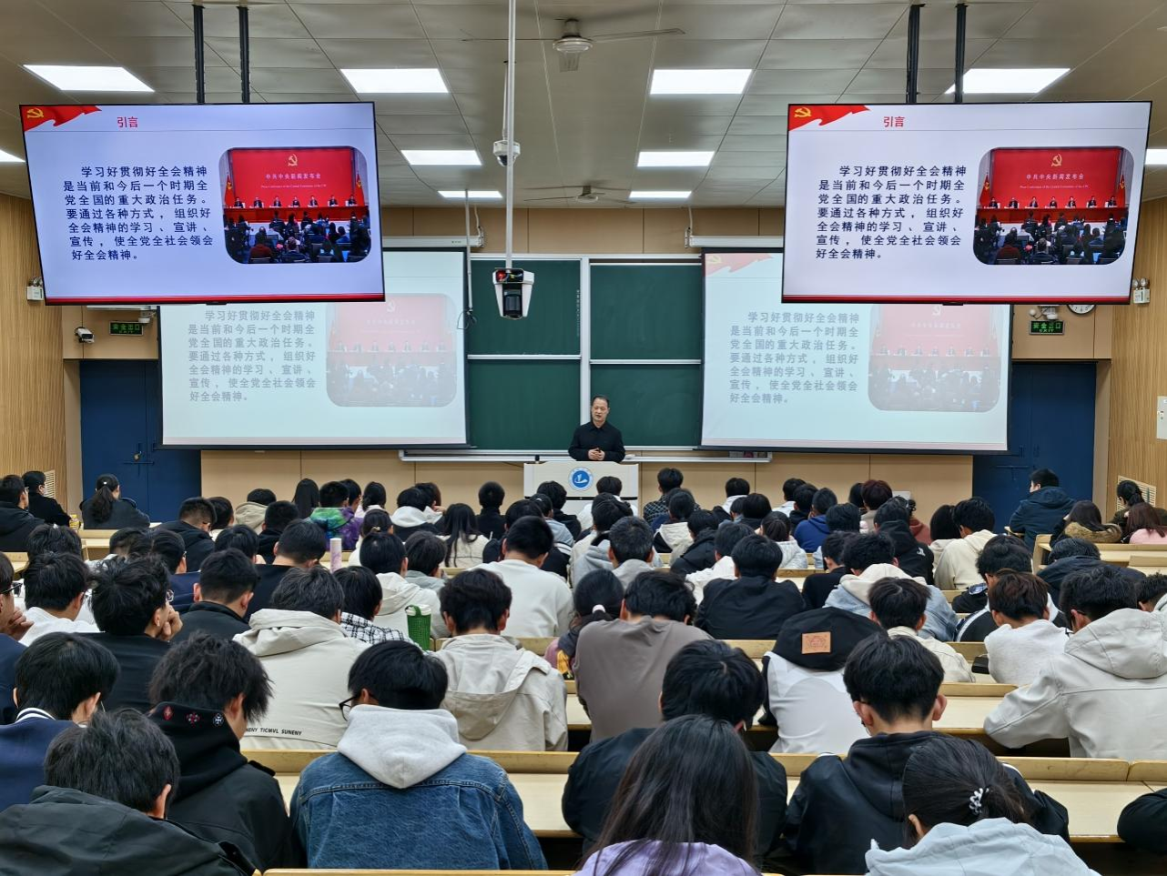 为深入学习贯彻党的二十届四中全会精神,11月11日下午,我院党委书记曹恒慧在10号楼B107为师生讲授了一堂思想深刻、内涵丰富的形势与政策课。全体辅导员及学生代表180余人参加了此次学习。