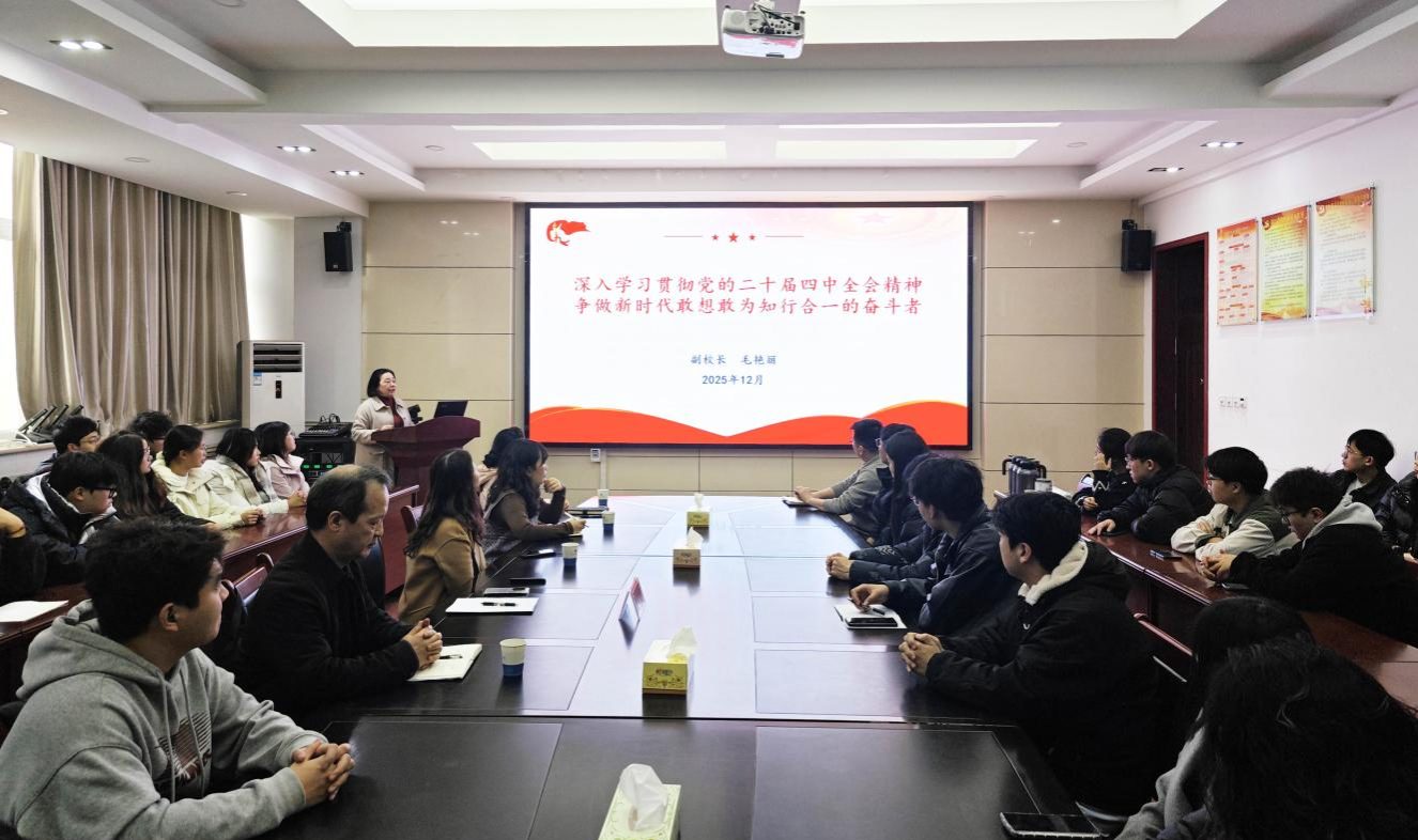 12月19日下午,副校长毛艳丽在9A315会议室以《深入学习贯彻党的二十届四中全会精神,争做新时代敢想敢为知行合一的奋斗者》为题,为市政与环境工程学院、材料与化工学院全体研究生和教师代表讲授思想政治理论课。
