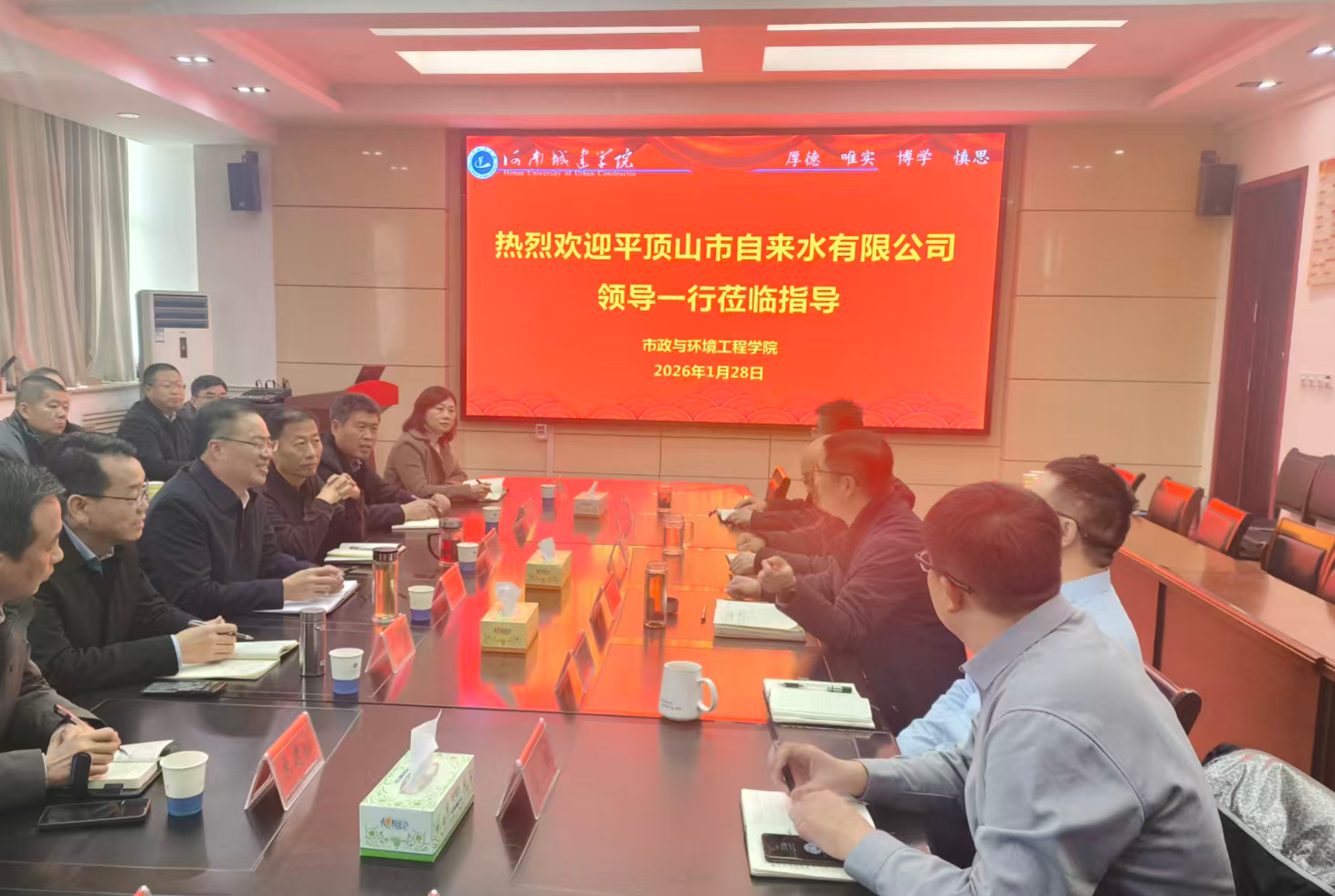 为高标准完成平顶山市自来水有限公司“十五五”规划编制,推动规划更贴合城市供水发展实际、更具实操性与前瞻性。1月28日下午,《平顶山市自来水有限公司“十五五”规划暨2035年远景规划》项目推进会在我院顺利召开。平顶山市自来水有限公司党委书记、董事长毕志伟带领班子成员及相关部门负责人莅临学院指导交流,市政与环境工程学院院长姜忠峰主持会议,副院长王超海、宋忠贤及学院相关领导、规划编制团队成员参会。