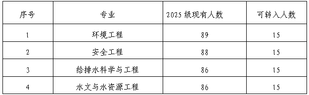 环境工程、给排水科学与工程、安全工程、水文与水资源工程专业,对学院内部互转专业以及外院转专业学生人数依据学院内各专业的协调发展,由市政与环境工程学院转专业领导小组确定如下: