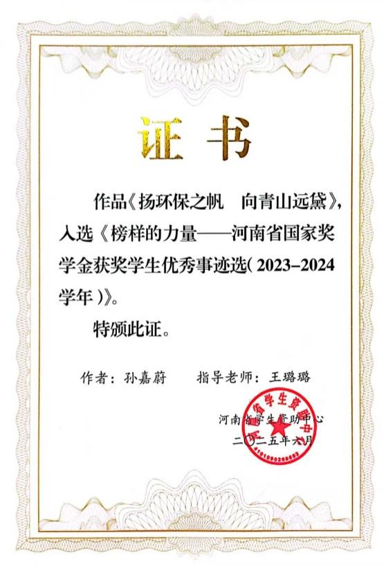 近日,由河南省学生资助中心组织编著的《榜样的力量》2023-2024学年河南省国家奖学金获奖学生优秀事迹选刊印,我校2024年国家奖学金获得者、市政与环境工程学院环境工程专业学生孙嘉蔚的优秀事迹被成功选录,在全省入选的三十名本科生优秀学生代表宣传推广优秀事迹中排在第一位。